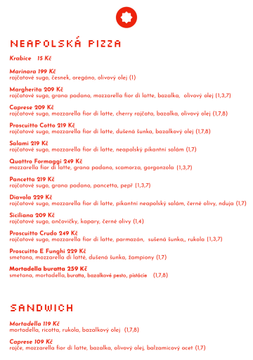 Máme pevné menu Neaposlké pizzy. Žádné divoké "české" receptury u nás nehledejte. Absolutně ctíme tradici neaposlké pizzy, najdete originální receptury a italské suroviny. Děláme to prostě tak, jak se to dělat má. Mimo neaposlké pizzy máme ještě pizza sendviče – to je vlastně polovina naší pizzy přehnutá a naplněná italskými dobrotami. Chutná parádně i studená, nebo druhý den ráno. Osvěžují pitivo a výběrový kafe na mlýnku je samozřejmost.